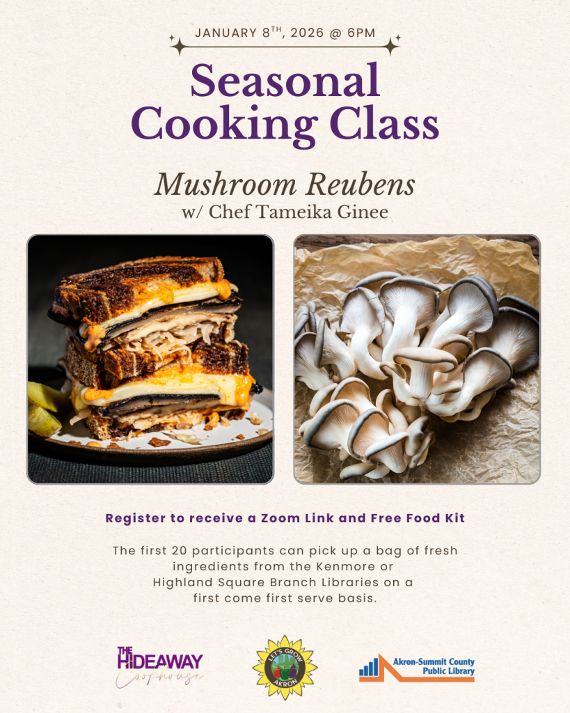 Let’s Grow Akron and Akron Public Library partner with Local Chefs to offer free Seasonal Cooking Workshops on the Second Thursday of each month. Zoom participation is unlimited. Food kits are made available at Kenmore, V. Odom and Highland Square Branch Libraries on a first come, first served to the first 10 people at each branch. Food kits are available to pick up from the library branches beginning the day before (Wednesday) at 12:00 pm. All who register will receive an email from the library with a recipe and Zoom link for the program several days prior to the event.